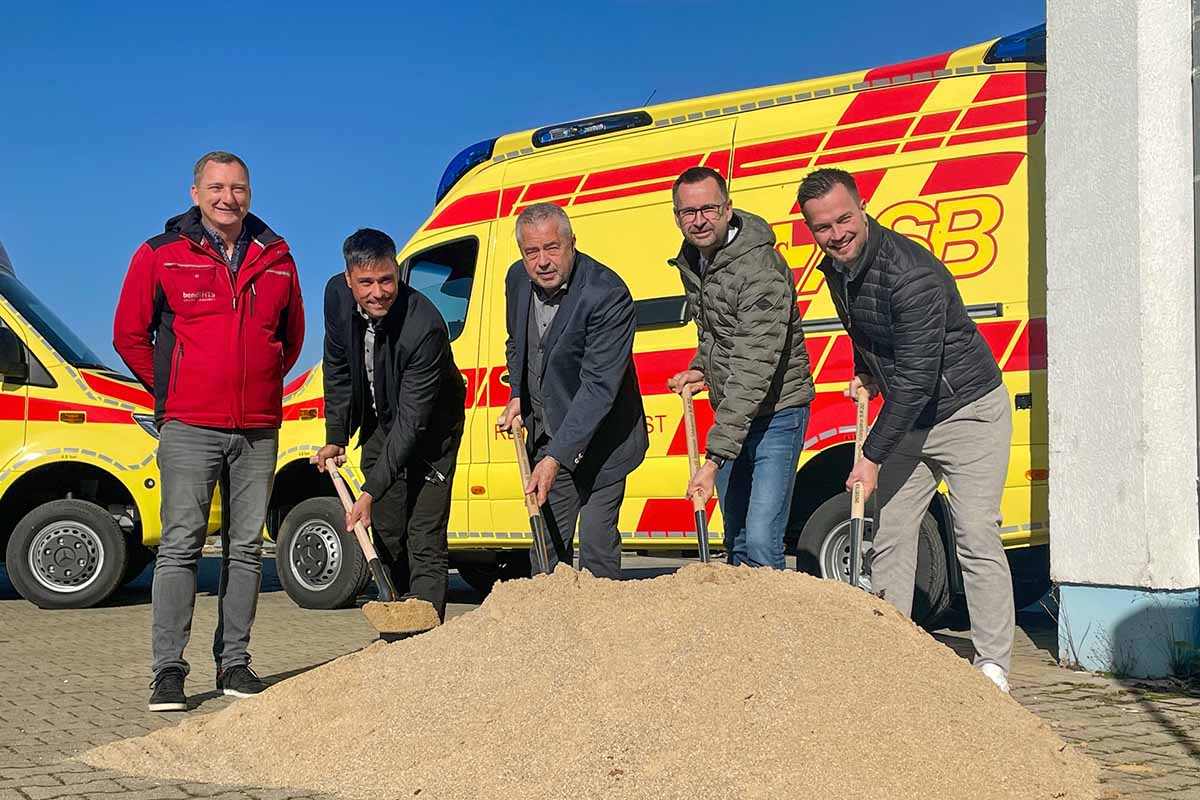 Zu den Anwesenden gehörten neben unserem Geschäftsführer Gunnar Stary auch Dipl.-Ing. Oliver Thomas (Geschäftsführer bauplanconcept ingenieure gmbh), Michael Geisler (Landrat des Landkreises Sächsische Schweiz-Osterzgebirge), Alexander Penther (Geschäftsführer ASB Neustadt) sowie Alexander Sachse (Bürgermeister Neustadt/Sa.). Gemeinsam setzten sie den symbolischen Spatenstich und machten damit den Weg frei für die Bauarbeiten.