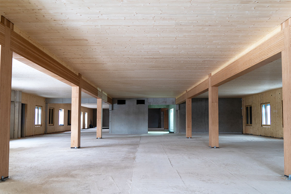 - Optimale Materialsynergie: Holz bietet ein angenehmes Raumklima, wirkt klimafreundlich durch CO₂-Bindung und kann als Haupttragelement dienen, während Beton und Stahl gezielt dort eingesetzt werden, wo es um Tragfähigkeit, Brandschutz und Schallschutz geht.