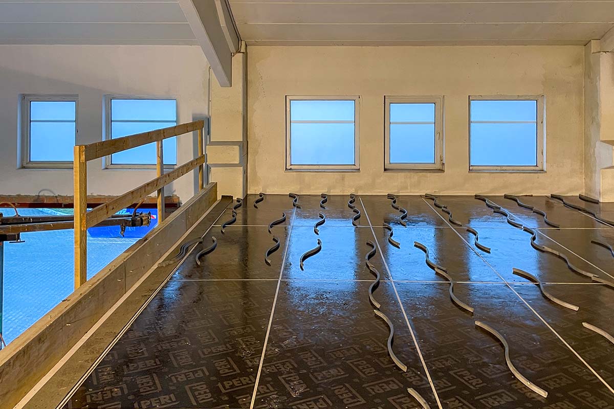 Im Bestandsgebäude arbeiten wir aktuell an den Schulungsräumen. Der Fußboden wurde bereits geschnitten, um die neue Grundleitung im Bestand verlegen zu können. Ergänzend realisieren wir in der bestehenden Fahrzeughalle eine Waschhalle mit darüberliegendem Lager sowie Elektro-Räumen.