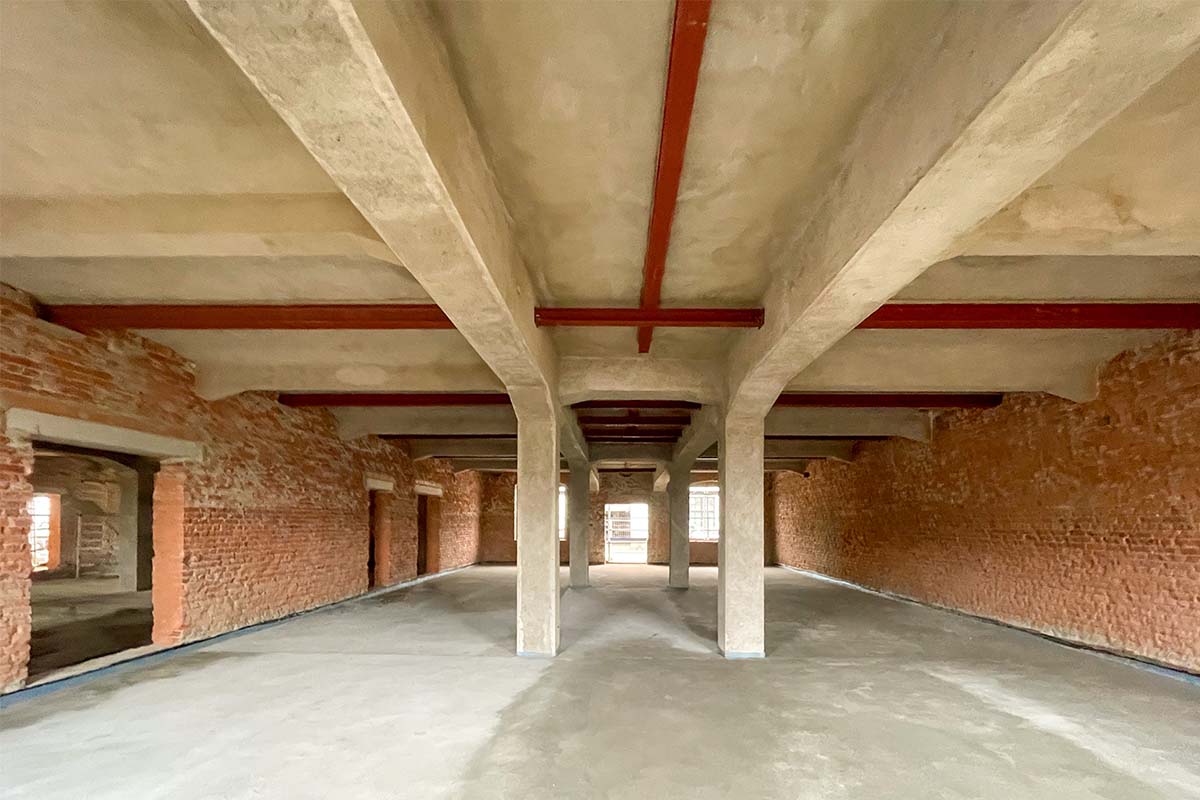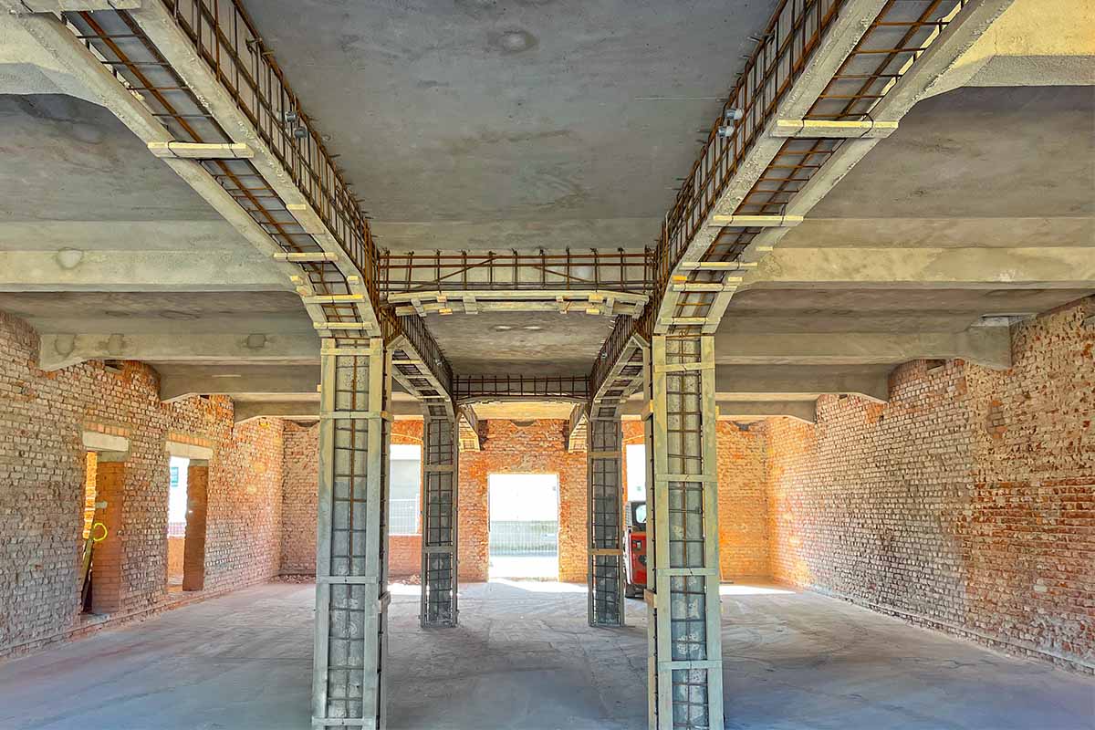 Das Ergebnis kann sich sehen lassen: Die neu ertüchtigten Unterzüge und Stützen sorgen für ein solides Tragwerk, das den Anforderungen des zukünftigen Nutzungszwecks – moderne Büro- und Gastronomiebereiche – gerecht wird. Zum Abschluss wurden die Deckenfelder durch Stahlträger zwischen den Unterzügen ertüchtigt, wodurch die Decke wieder vollständig tragfähig ist.