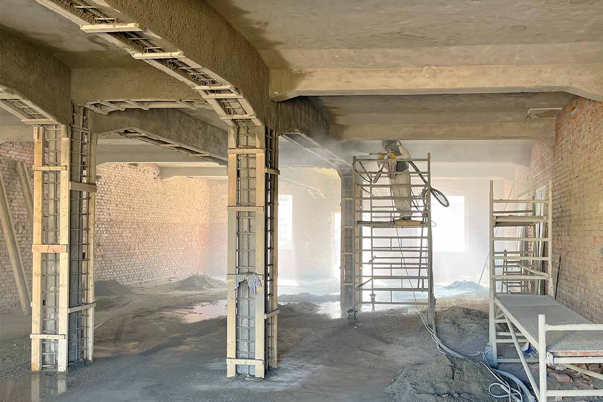 Anschließend wurde Beton im Spritzverfahren auf den Bewehrungskorb aufgetragen und entsprechend der geplanten Kubatur abgezogen, wodurch eine gleichmäßige, stabile und dichte Schicht entstand.