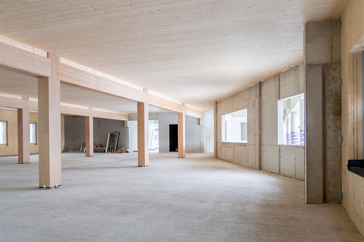 - Optimale Materialsynergie: Holz bietet ein angenehmes Raumklima, wirkt klimafreundlich durch CO₂-Bindung und kann als Haupttragelement dienen, während Beton und Stahl gezielt dort eingesetzt werden, wo es um Tragfähigkeit, Brandschutz und Schallschutz geht.