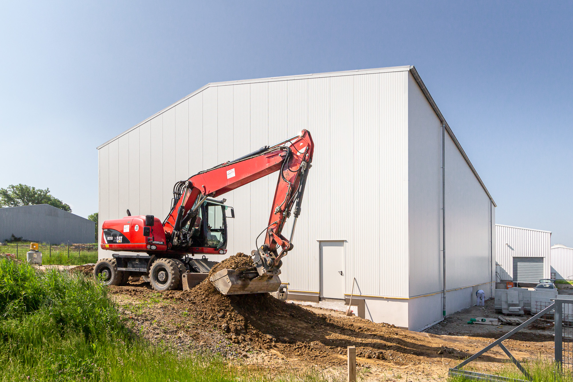 Bauleiter Sandro Kutzner und Polier Christoph Glaser waren mit ihrem Team von Januar bis Juli 2021 im Einsatz und meisterten jede Herausforderung mit Bravour. Vor den eigentlichen Baumaßnahmen musste ein vollständiger Bodenaustausch stattfinden, um die geforderte Tragfähigkeit zu erhalten. Dazu wurde der Baubereich komplett ausgehoben und mit einem trag- und verdichtungsfähigen Material wieder aufgefüllt. Anschließend konnten wir die Fundamente und die oberflächenfertige Bodenplatte herstellen, auf die die Stahlhallenkonstruktion montiert wurde. Während der Montagearbeiten für die Stahlhalle haben wir mit zwei Treppenanlagen für die Zugänglichkeit der Halle gesorgt und anschließend das Gelände und die Außenanlagen wiederhergestellt.