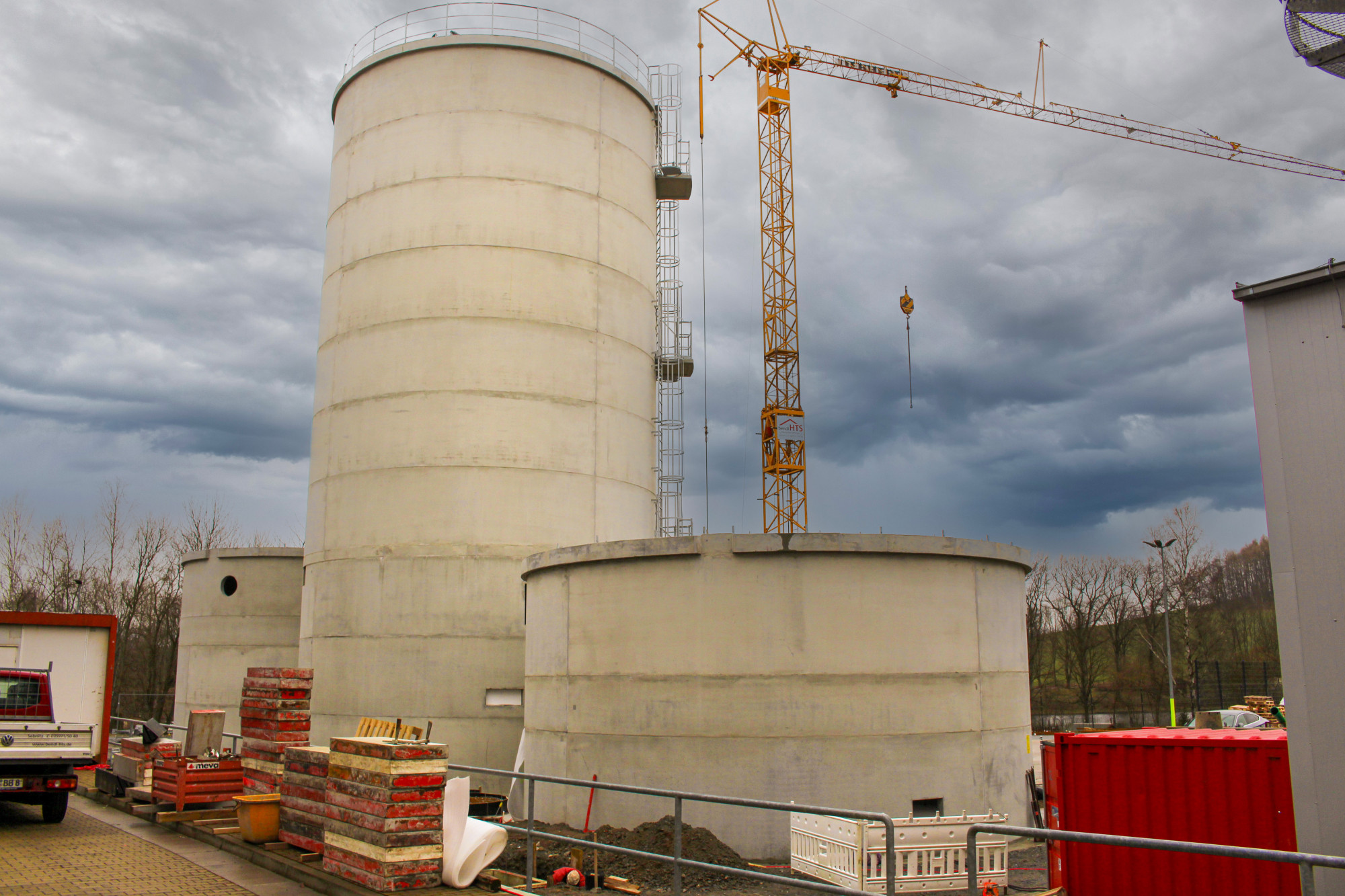 Nach erfolgreichem Abschluss der Tiefbauarbeiten konnten die Teams der Poliere Sven Hanke und Christoph Glaser mit den Rohbauarbeiten für die Verbrennungsanlage beginnen. Drei polygonale Bodenplatten mit jeweils 30, 40 und 50 Zentimeter Stärke sowie einer Gesamtfläche von jeweils 100 m² wurden in kürzester Zeit von uns gegossen. Nach vollendeter Arbeit wird nun mit den Bauarbeiten für die beiden Kesselhäuser sowie der Hackschnitzelanlage begonnen. Anschließend errichten wir an einem der Silogebäude ein Eingangsportal aus Ortbeton mit einer Gesamthöhe von über fünf Meter.