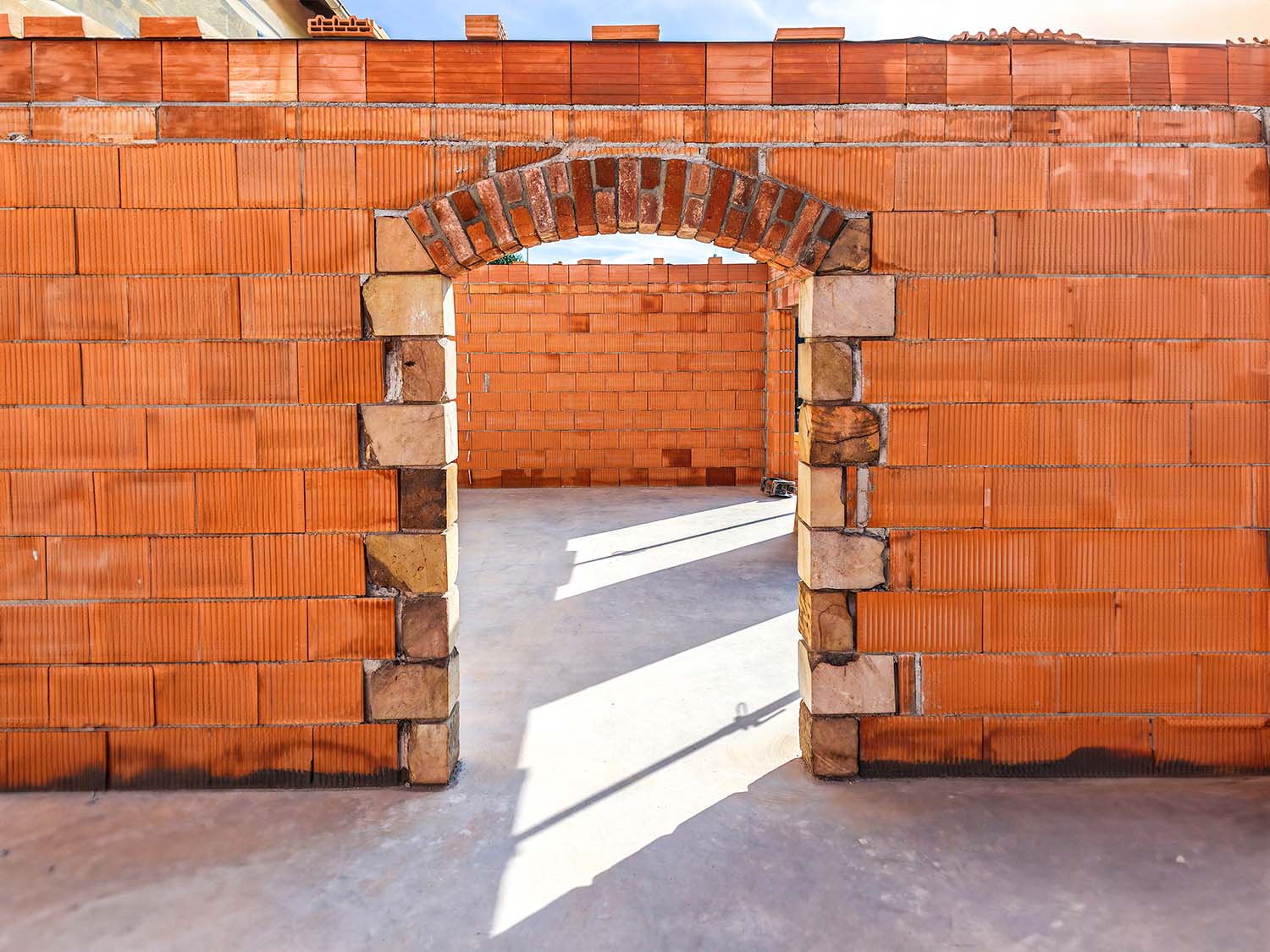 Für den neuen Anbau wurde zunächst die Bodenplatte hergestellt, danach wurde das Gebäude hochgemauert und eine neue Stahlbetondecke eingezogen. Ein besonderes handwerkliches Detail ist der gemauerte Segmentbogen im Anbau.