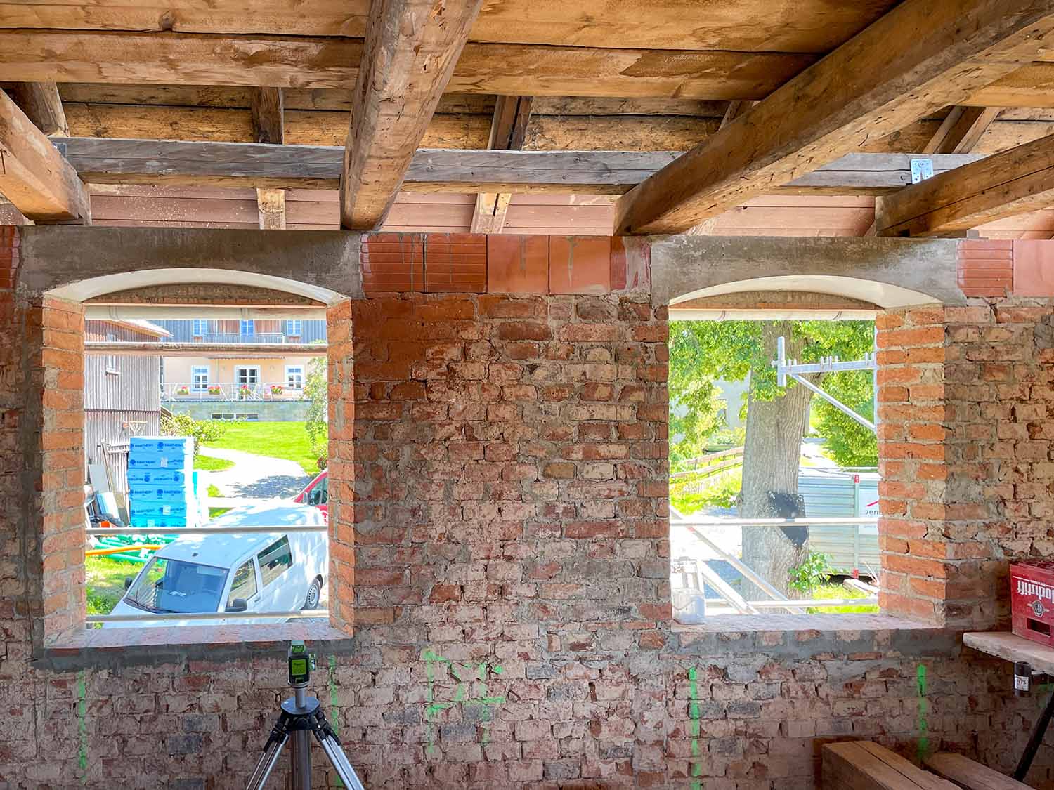 Innenwände wurden erneuert, ein neuer Dachstuhl errichtet, der Giebel ausgemauert und anschließend von außen verputzt.