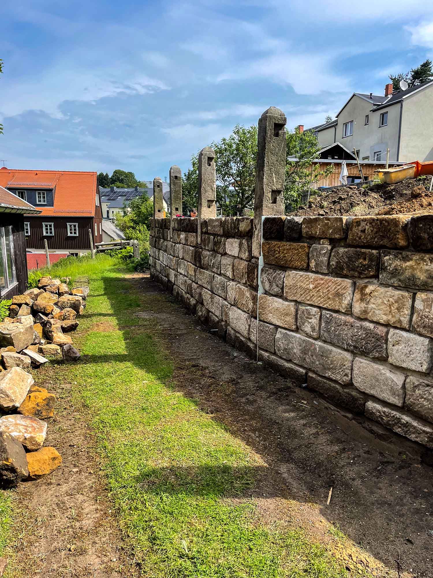 Zu Beginn der Arbeiten wurde der alte Stallanbau zurückgebaut. Anschließend entstand aus großen Sandsteinen eine rund 35 Meter lange Grundstücksmauer, die das Gelände neu strukturiert.